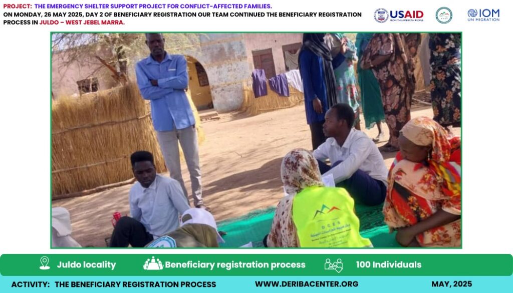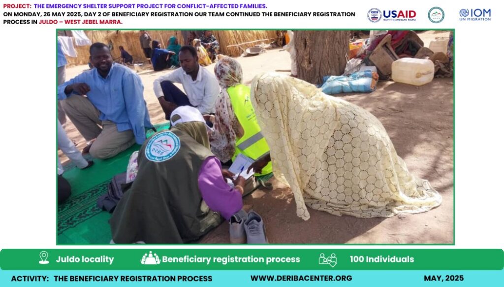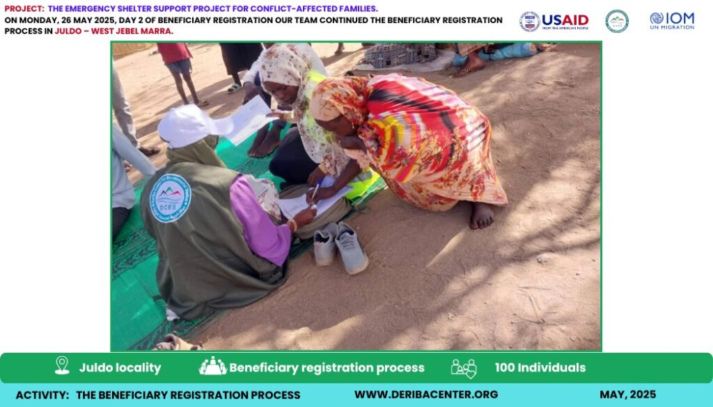 Our team continued the beneficiary registration process in Juldo, West Jebel Marra, as part of the Emergency Shelter Support Project for conflict-affected families.